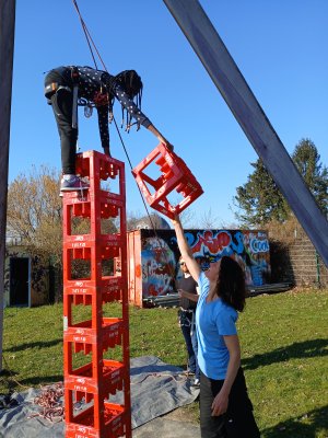 Die Kinder werden einzeln und nacheinander in Klettergurten gesichert. Sie bauen und erklimmen einen Turm aus Getränkekisten. Sie trainieren ihr Körpergefühl und erfahren Selbstwirksamkeit. Zu dem Tagesablauf gehört auch immer Freispiel, ganz nach dem Motto „der Abenteuerspielplatz ist unser erster Pädagoge“: - Begrüßung - Eisbrecherspiel - Aktivität (Kistenklettern) - Freispiel - Abschlussrunde und Verabschiedung.